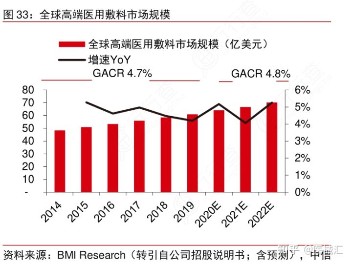 2019年全球高端医用敷料市场为60.9亿美元,5年复合年均增长率为4.7%,高于敷料市场增速。据BMI统计,高端敷料市场有望在2022年达到70.15亿美元。