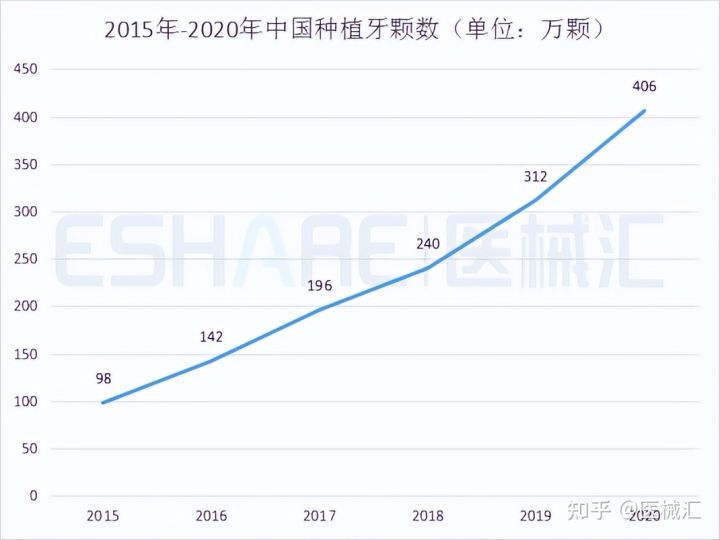据《2020年中国口腔医疗行业报告》数据显示,2020年我国种植牙数量约为406万颗,目前我国种植牙市场规模已近1600亿元,是全球增长最快的种植牙市场之一。
