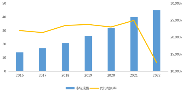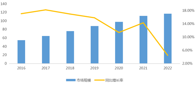 图:2016-2022年中国关节市场规模(单位:亿元)