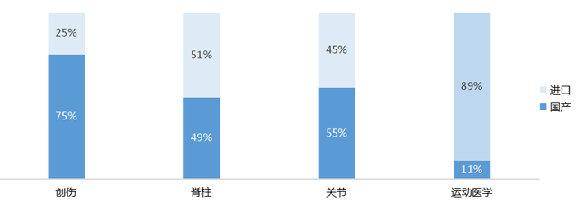 图:2022年骨科植入物细分市场进口与国产占比情况
