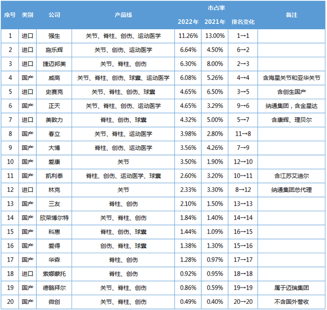 国产骨科医疗器械市场近年来发展迅猛,据不完全统计,骨科植入市场有超1200家企业参与市场竞争。但国产企业主要集中在低端市场低价竞争,高端市场大部分被外资品牌占据。集采助力国产企业打开市场渠道,也助推国产骨科企业创新。2022年,国内骨科市场的国产化程度进一步加深,国产龙头企业的市占率快速提升。
