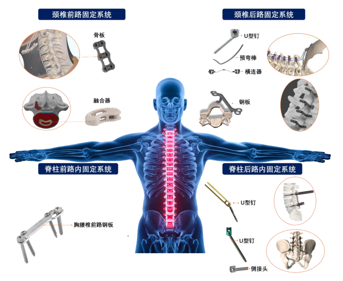 脊柱类植入产品主要是指可实现椎体切除后的矫正、复位、融合等功能的内固定人体植入物,可用于由创伤、退变、畸形或其他病理原因造成的各类脊柱疾患的外科治疗。